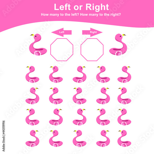 Obraz premium Left or Right Game for Preschool Children. Educational printable math worksheet. Additional math for kids. Vector illustration in cartoon style.