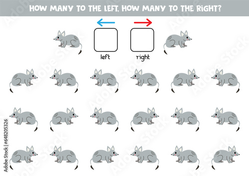 Fototapeta premium Left or right with cute cartoon gray bandicoot. Logical worksheet for...