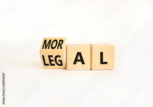 © Dzmitry, Obraz premium Legal or moral symbol. Businessman turns wooden cubes and changes the word Legal to Moral on a Beautiful white table white background. Business and Legal or moral concept. Copy space.