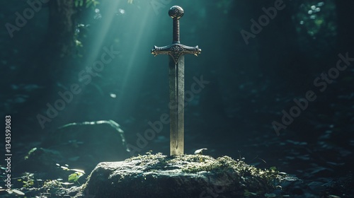 © Emma, Naklejka premium Legendary Excalibur Sword in Stone: Symbol of Courage and Power