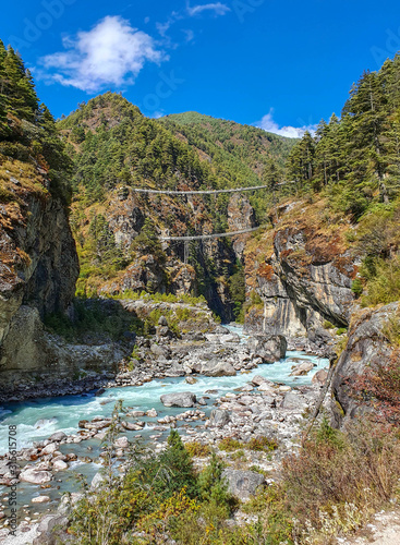Fototapeta premium Legendary Hillary bridge view in Sagarmatha National Park. Everest base camp trek itinerary: way from Phakding to Namche Bazar, the sherpa's capital.