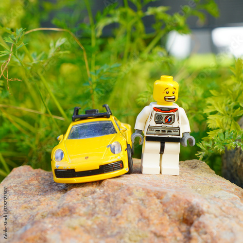 Obraz premium Lego astronaut and yellow toy car on a rock with green foliage background