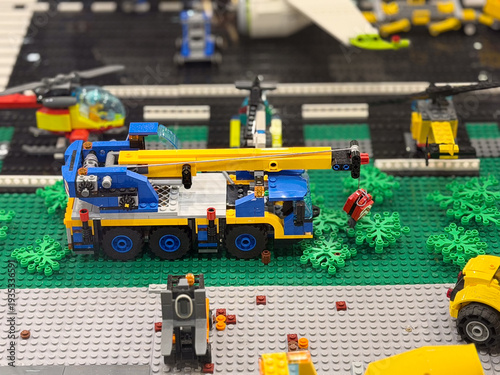 © Marina Chernivetskay, Fototapeta premium Lego crane truck lifting red object