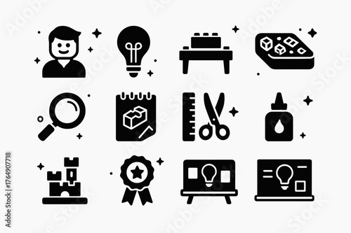 © Coosh448, Fototapeta premium LEGO Creativity Icons. LEGO Creativity Workshop. Solid icons set of LEGO Creativity Workshop: instructor figure, lightbulb icon, build table, tray of bricks,