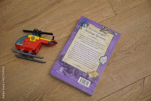 © Everyday Frame, Naklejka premium Lego helicopter toy and book on a wooden surface, top-down view