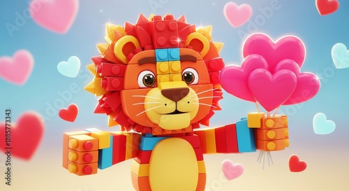 Fototapeta premium Lego lion holding heart balloons