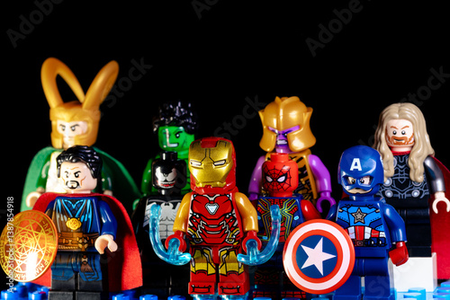 © Klochkov, Obraz premium LEGO Marvel Avengers. Doctor Strange, Venom, Iron Man, Spider Man, Captain America, Loki, Hulk, Thanos and Thor on black background