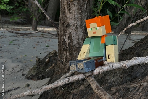 © zayacsk, Obraz premium LEGO Minecraft action figure of main female character Alex, sitting on dried driftwood branch on sandy bank of Danube river, tree trunks and sandy beach in background.