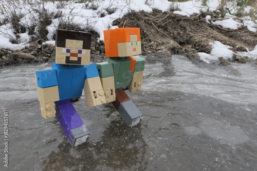 © zayacsk, Naklejka premium LEGO Minecraft action figures of main characters Steve and Alex gliding on ice of frozen puddle on edge of agricultural field, snowy puddle bank and frozen mud in background.