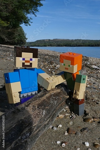 © zayacsk, Fototapeta premium LEGO Minecraft action figures of Steve and Alex holding trunk of some driftwood on sandy bank of Danube river on borderline between southern Slovakia and Hungary. Summer blue skies, windblown clouds.