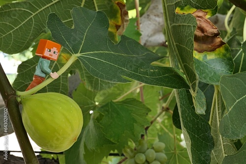 © zayacsk, Obraz premium LEGO Minecraft figure of Alex climbing on green leaf of Fig Wine tree, latin name Ficus Carica, mature fig fruit growing on a branch under her.
