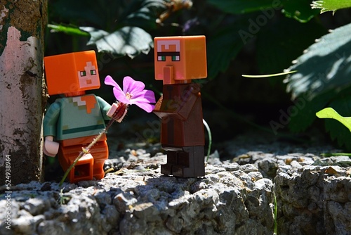 © zayacsk, Obraz premium LEGO Minecraft figure of Alex giving pink chalice shaped flower to villager mob while standing on stone murral in real garden, summer daylight sunshine.