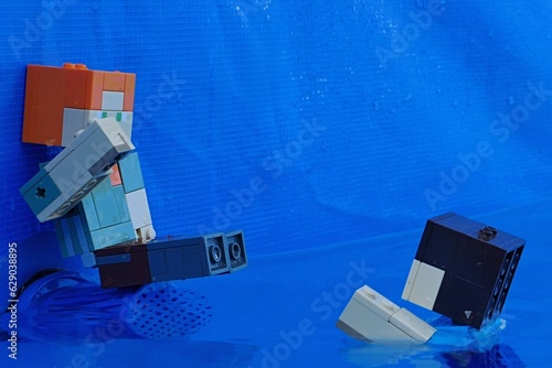 © zayacsk, Obraz premium LEGO Minecraft figure of Alex sitting on blue pool filter plastic sifter cover, raising hand to Steve swimming towards her