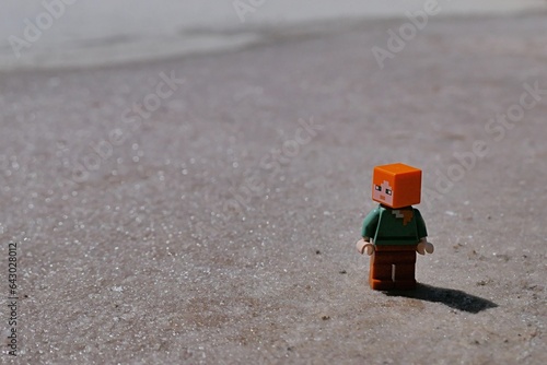 © zayacsk, Obraz premium LEGO Minecraft figure of Alex standing on crystallic salty field, remains of fifth stage of sea salt production, looking left.