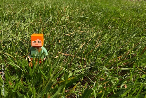 © zayacsk, Naklejka premium LEGO Minecraft figure of Alex walking across freshly cultivated an mowned garden lawn, spring daylight sunshine.