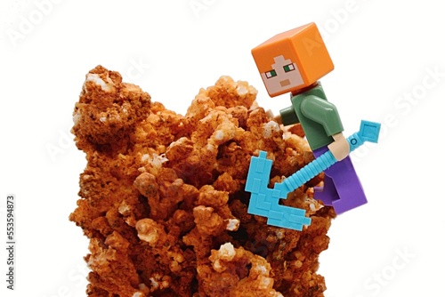 © zayacsk, Fototapeta premium LEGO Minecraft figure of Alex with diamond pickaxe climbing on Calcite (Calcium Carbonate) stone, white background.