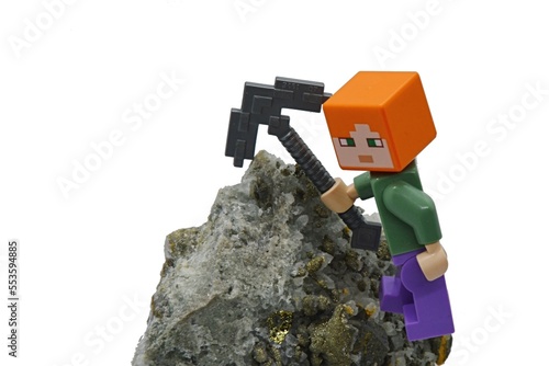 © zayacsk, Fototapeta premium LEGO Minecraft figure of Alex with iron pickaxe trying to mine Chalcopyrite mineral rock, white background.