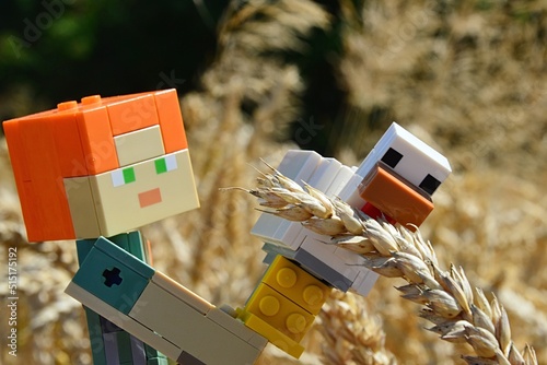 © zayacsk, Naklejka premium LEGO Minecraft figure of Alexraising chicken to feed her with mature grains of wheat directly on sunlit agrcitultural field, summer daylight sunshine.