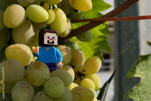 © zayacsk, Obraz premium LEGO Minecraft figure of main hero Steve standing on cluster of mature vine grapes, summer daylight sunshine.