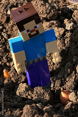 Naklejka premium LEGO Minecraft figure of smiling Steve checking planted onions in garden soil, spring afternoon sunshine.