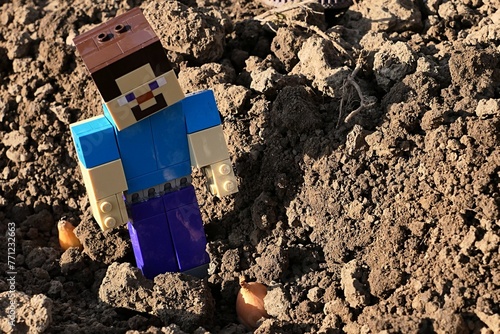 © zayacsk, Fototapeta premium LEGO Minecraft figure of smiling Steve walking in seed bed checking planted onion seedlings, sunlit by afternoon sunshine.
