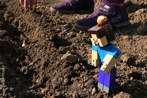 © zayacsk, Naklejka premium LEGO Minecraft figure of smiling Steve with real onion nurseling on his head checking planted onions in soil, children shoes in background.
