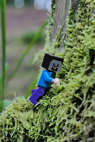 Obraz premium LEGO Minecraft figure of Steve climbing on tree trunk covered with dense moss...