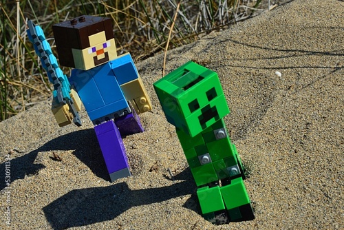 © zayacsk, Obraz premium LEGO Minecraft figure of Steve with diamond sword attacking hostile explosive green Creeper mob from behind on sandy landscape with dried grass in background.