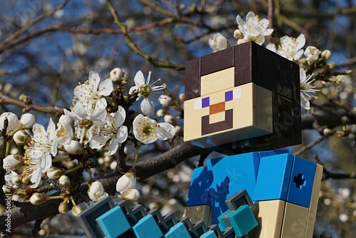 © zayacsk, Naklejka premium LEGO Minecraft figure of Steve with diamond sword examining spring blossoming white flowers on branch of Blackthorn tree, latin name Prunus Spinosa.