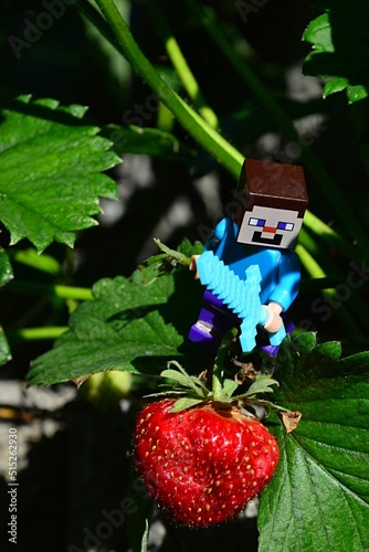 © zayacsk, Fototapeta premium LEGO Minecraft figure of Steve with diamond sword reaching for mature fresh strawberry growing on strawberry plant, prepared to cut it.