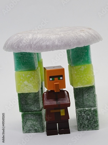 © zayacsk, Naklejka premium LEGO Minecraft figure of villager standing under the roof made of melted scented pink wax, supported by stearine wax cubes of various green colours.