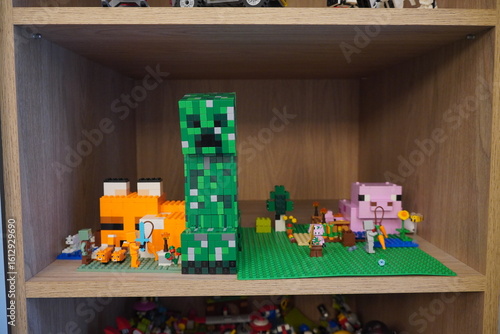 © Everyday Frame, Naklejka premium Lego Minecraft Figures and Landscape on a Wooden Shelf