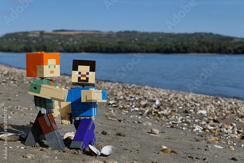 © zayacsk, Obraz premium LEGO Minecraft figures of Steve and Alex, dancing waltz between clams and stones on sandy river Danube bank, borderline between Slovakia and Hungary. Forested opposite bank and blue skies visible.