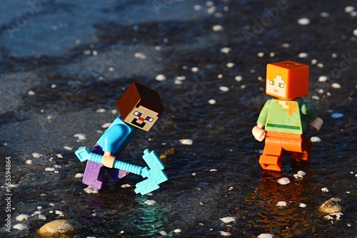 © zayacsk, Obraz premium LEGO Minecraft figures of Steve and Alex on thick layer of real ice Steve is trying to break ice with his diamond pickaxe.