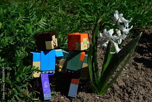 Naklejka premium LEGO Minecraft figures of Steve and Alex walking past white blossoming Common Hyacinth flowers, latin name Hyacinthus Orientalis, in spring garden. Green lawn in background.