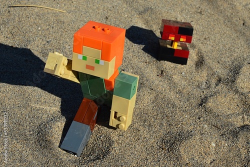 © zayacsk, Fototapeta premium LEGO Minecraft large action figure of Alex chased by hostile mob Magma Cube on sandy desert landscape in afternoon sunshine.