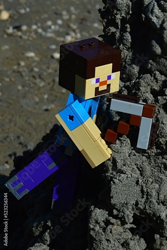 Obraz premium LEGO Minecraft large action figure of Steve with stone pickaxe, ready to mine some wet black sand from steep hill, summer daylight sunshine.