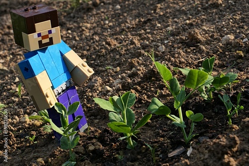 © zayacsk, Fototapeta premium LEGO Minecraft large figure of Alex is happy above as he found spring pea (pisum sativum) sprouts in freshly cultivated garden bed, late afternoon sunshine.