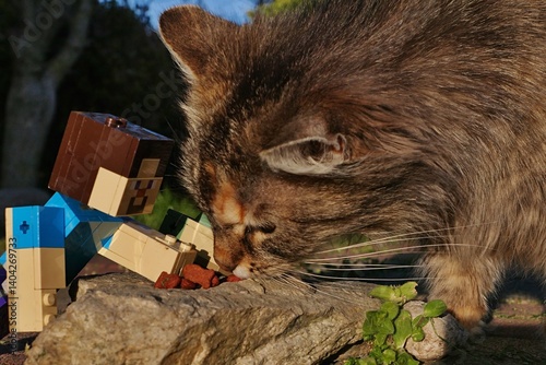 © zayacsk, Fototapeta premium LEGO Minecraft large figure of main character Steve feeding tabby long hair crossbreed young female cat on flat stone. Sunlit by spring daylight sunshine.
