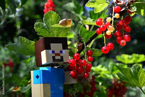 © zayacsk, Naklejka premium LEGO Minecraft large figure of main character Steve, harvesting mature Redcurrant berries from a branch, summer daylight sunshine.