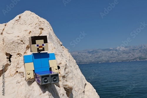 Naklejka premium LEGO Minecraft large figure of main character Steve sitting on rocky cliff of Radanovac beach near Razanac, northern Dalmatia, Croatia. Velebit mountain in background, august bright sunshine.