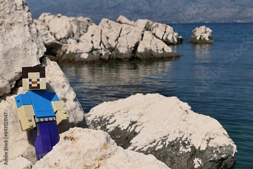 © zayacsk, Naklejka premium LEGO Minecraft large figure of main character Steve standing on rocks of Radanovac beach near Razanac, northern Dalmatia, Croatia. Velebit mountain in background, august bright sunshine.