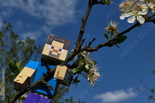 © zayacsk, Naklejka premium LEGO Minecraft large figure of Steve climbing on branch of spring blossoming pear tree, latin name Pyrus, blue skies with some clouds in background.