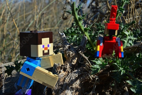 © zayacsk, Fototapeta premium LEGO Minecraft large figure of Steve rescuing his red Minecraft parrot siting on spiky thistle plant. Summer daylight sunshine, blue skies in background.