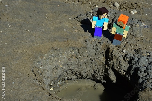 © zayacsk, Fototapeta premium LEGO Minecraft large figures of Alex and Steve characters are looking on large wet muddy pit or crater on black sand beach with dirty water on bottom. Summer daylight sunshine.