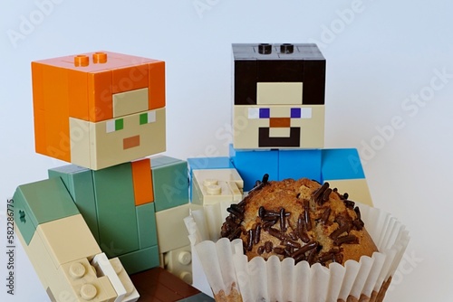 © zayacsk, Fototapeta premium LEGO Minecraft large figures of Steve and Alex, Steve is holding huge muffin cake with chocolate chips on top in a white paper cup. Light grey background.