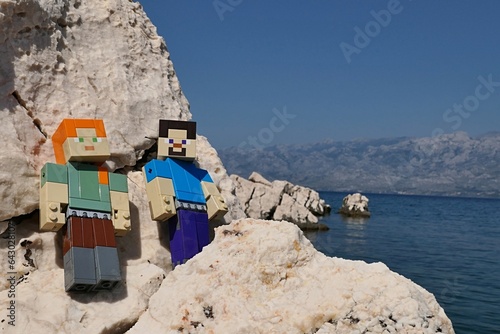 Naklejka premium LEGO Minecraft main characters Alex and Steve standing on rocks sunlit rocky beach of Razanovac near Razanac town, northern Dalmatia.