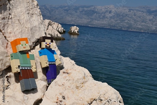 © zayacsk, Obraz premium LEGO Minecraft main characters Alex and Steve sunbathing on rocks sunlit rocky beach of Razanovac near Razanac town, northern Dalmatia.