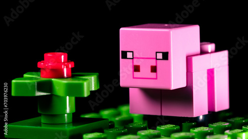 © Klochkov, Obraz premium LEGO Minecraft pig on a green meadow next to a red flower