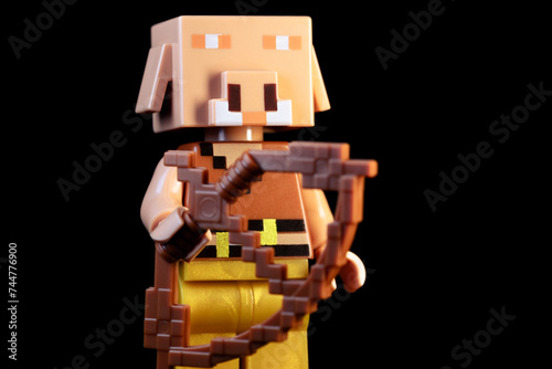 © Klochkov, Naklejka premium LEGO Minecraft Piglin with bow and arrow. Pig face mob